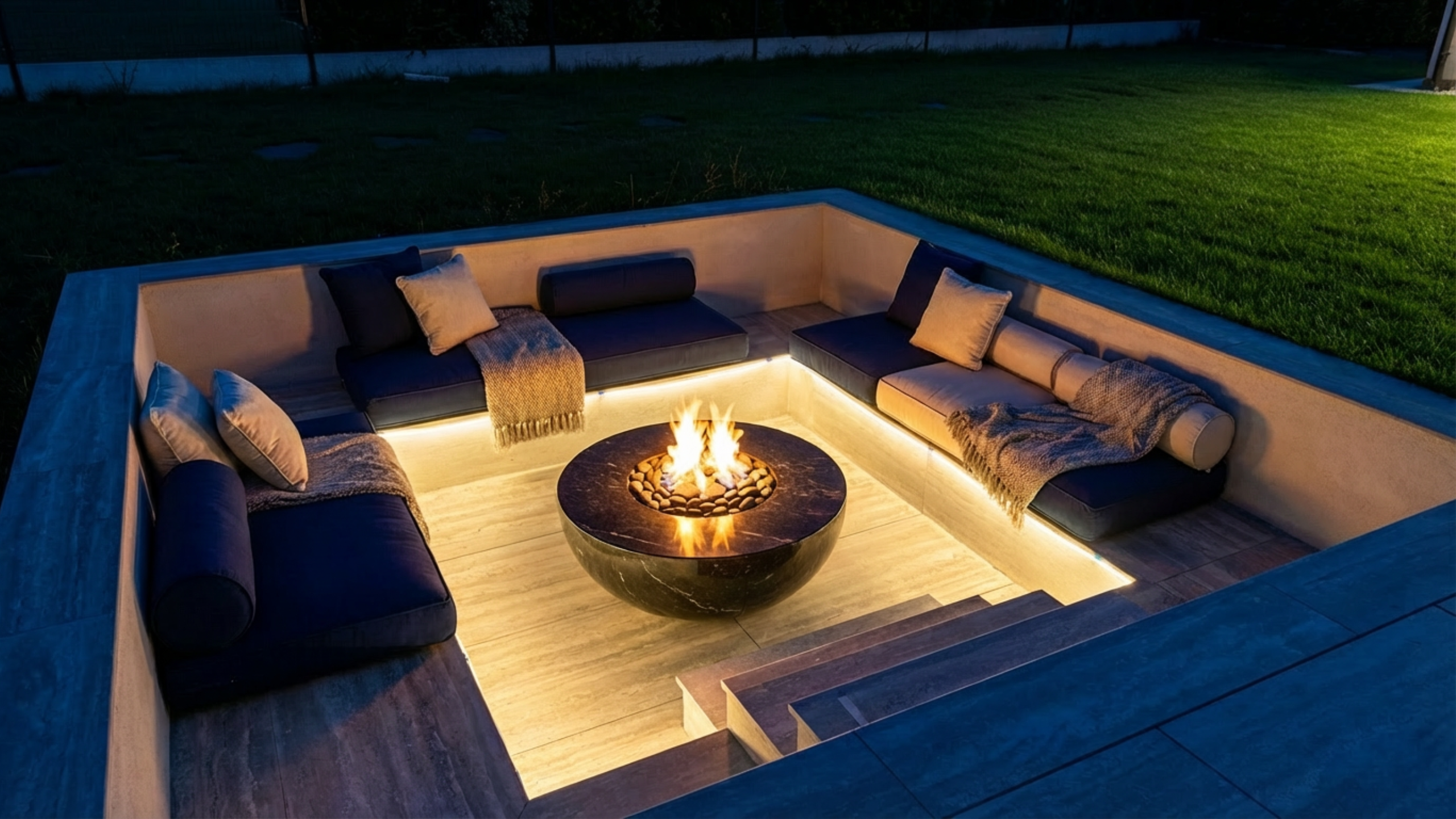 La fosse de discussion est un aménagement moderne qui crée un espace chaleureux pour se retrouver en famille ou entre amis.