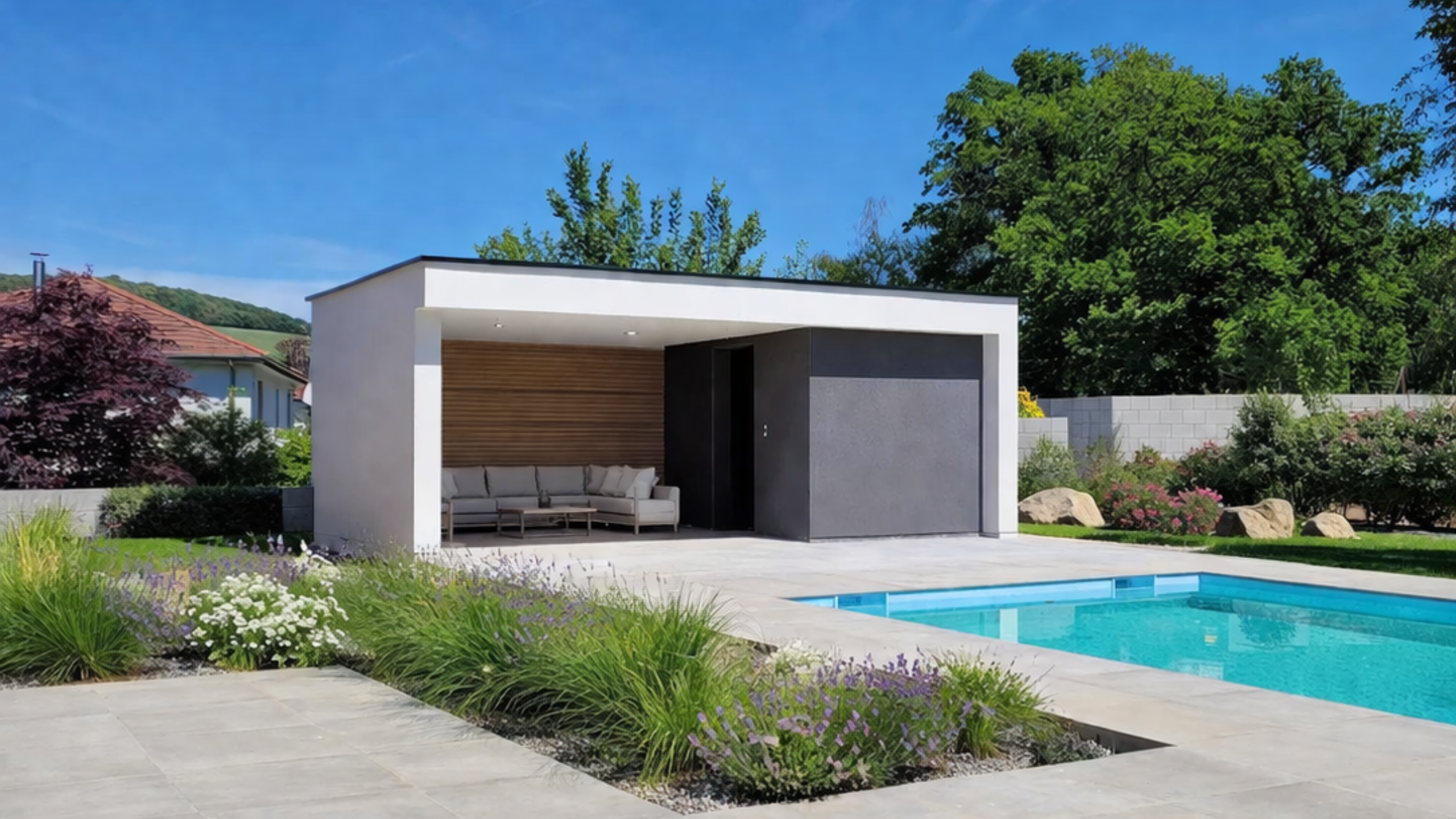 Le pool house complète parfaitement un espace piscine. Il peut accueillir une cuisine d’été, un espace détente ou encore un lieu de rangement.